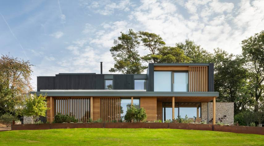 A modernist replacement dwelling, built from scratch by Barr Group, where the modular flint and timber structure finds its sense of place.